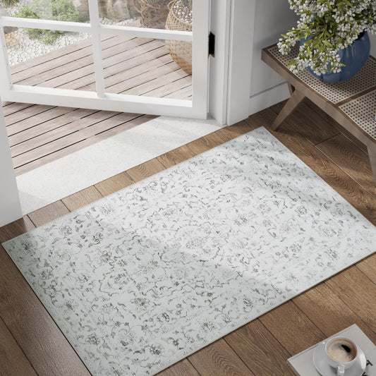 RUGKING Grey Vintage Area Rug Floral Carpet Distressed Mat, Foldable Non Slip Accent Rug for Kitchen Living Room
