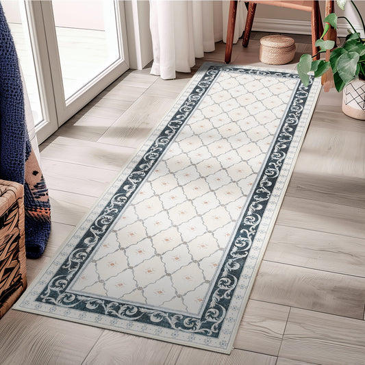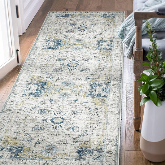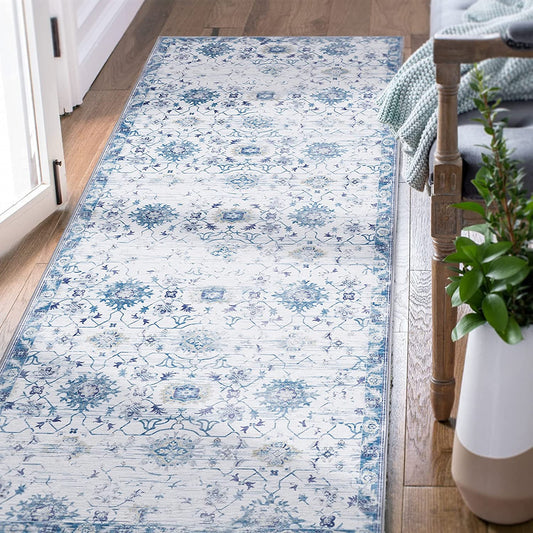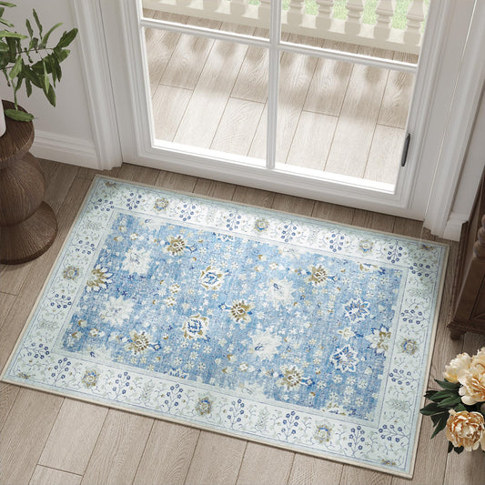 RUGKING Blue Vintage Area Rug Floral Carpet Distressed Mat, Foldable Non Slip Accent Rug for Kitchen Living Room