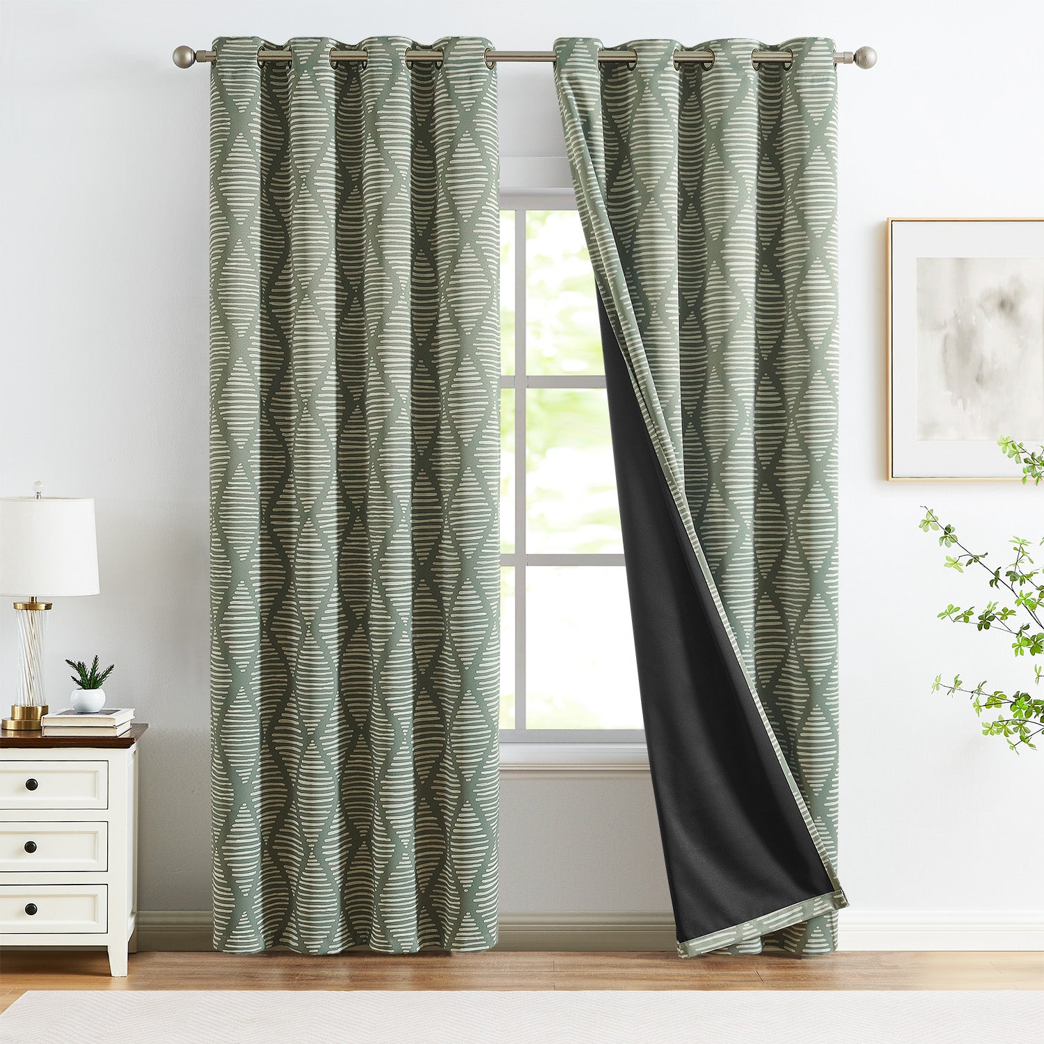 Curtainking Geometric Pattern Blackout Living Room Curtains are ideal for creating a relaxing, peaceful and free living space for you. These room darkening curtains can block out almost all light (darker colours have a better effect) and reduce noise so you can get a better night's sleep. These thermal insulted curtains are made from 100% polyester which is a soft and silky fabric, same material back as front, grommet top design makes it easy to hang and style your curtains. These geometric pattern curtains complement any home decor and bring an elegant look to the window. It provide privacy and are environmentally friendly, no chemical coating, no toxic odour. Our blackout curtains are not only a good choice for bedrooms, but also for living rooms, dining rooms, offices, nurseries and children's rooms. Machine washable, wrinkle free, even a little left over will disappear after hanging for a few weeks or warm ironing.