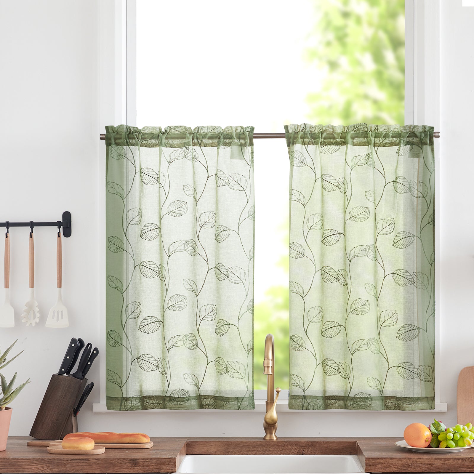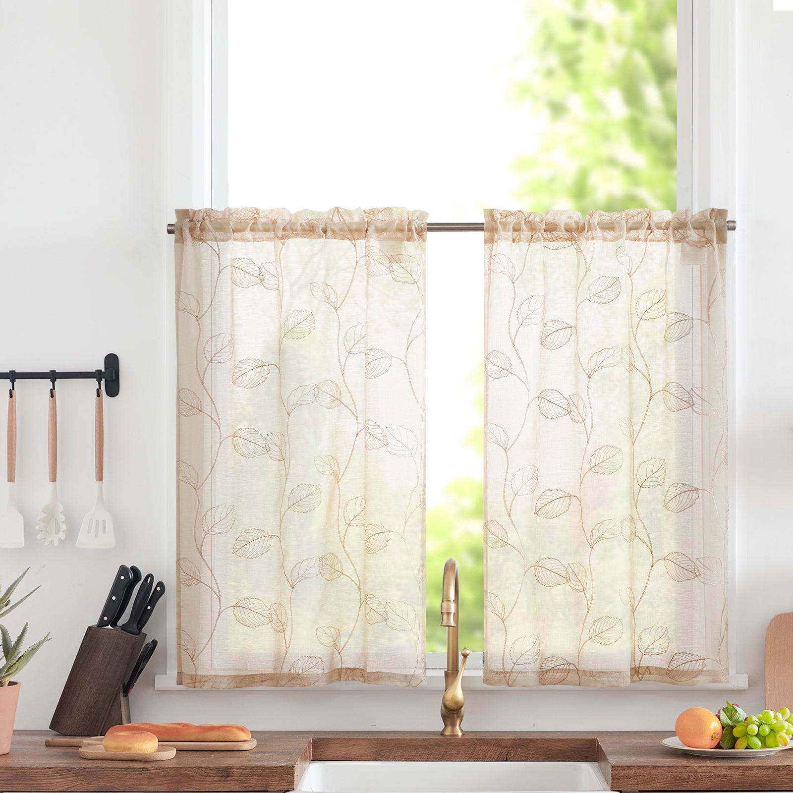 Curtainking Kitchen Curtains Leaf Embroidered Sheer Kitchen Windows Small Cafe Curtains Rod Pocket 2 Panels